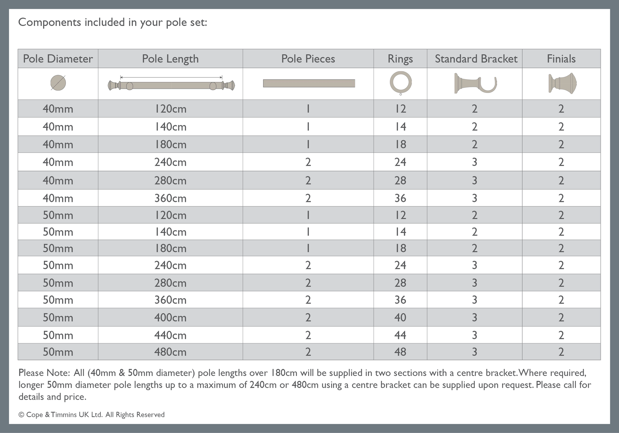 We are happy to cut and drill our standard curtain pole lengths to your requirements. Simply add a note confirming your curtain pole length (excluding finials) in the “Note to Cope & Timmins” box on the shopping cart page or call us on 01751 430350.